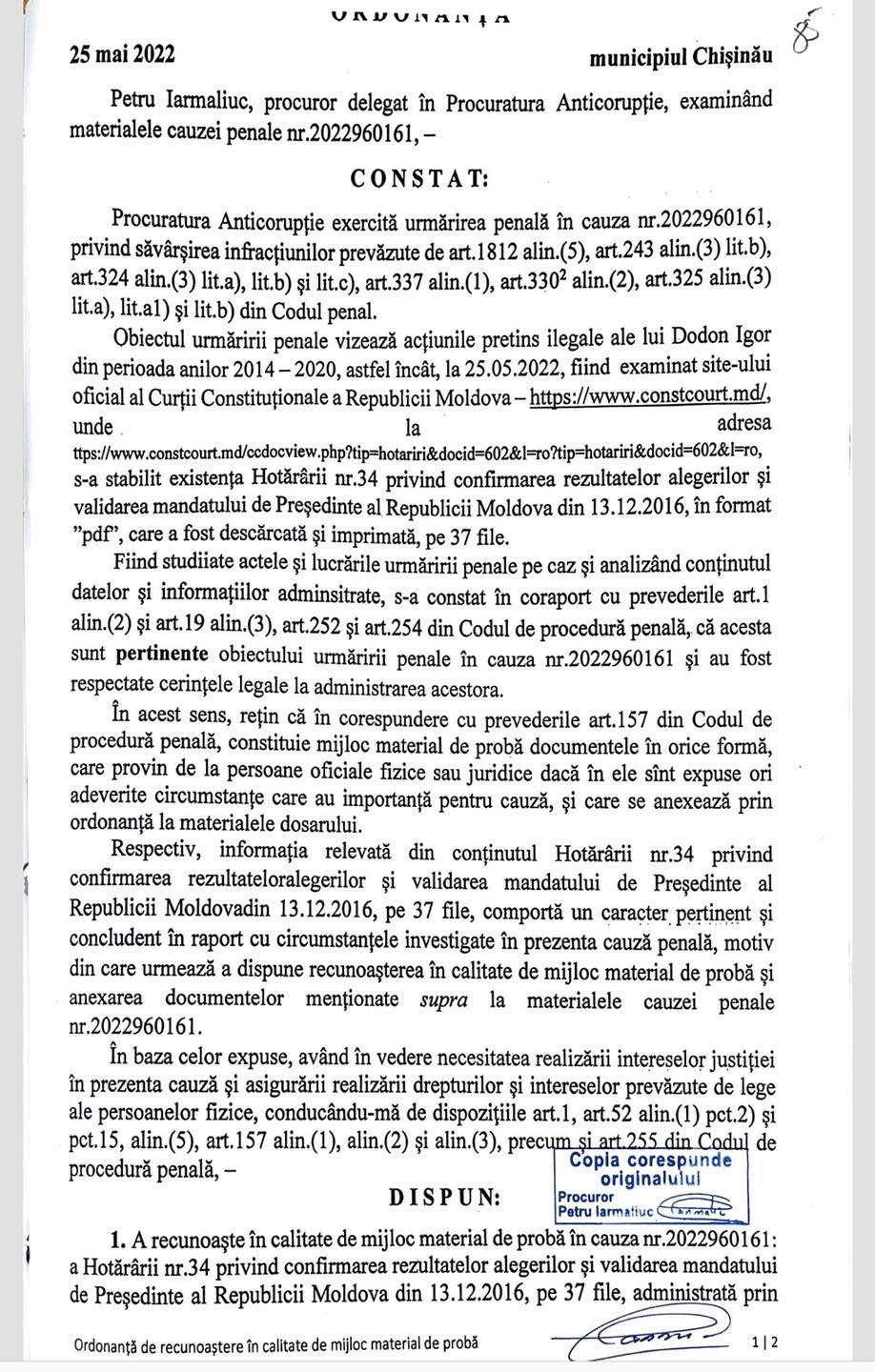Mai jos atașez o pretinsă „probă”. La modul concret, procurorul, cercetând la fața locului, la el în birou, întocmește proces verbal de a califica drept probă decizia Curții Constituționale despre aprobarea rezultatelor alegerilor prezidențiale ... și anexează totul la dosar ca element în dosarul de învinuire. Chiar și pentru un student de la anul 2 de la facultatea de drept e clar că nu poți face cercetarea „la fața locului” pe o pagină de internet ca să găsești un act oficial publicat în Monitorul Oficial”, scrie Igor Dodon pe pagina sa de Facebook.