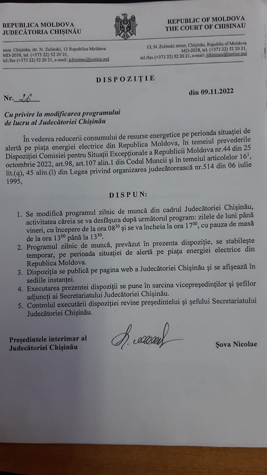 Judecătoria Chișinău sediul Centru și-a schimbat programul de activitate, ca urmare a deciziei Comisiei pentru Situații Excepționale a Republicii Moldova din 25 octombrie, privind reducerea consumului de energie electrică.