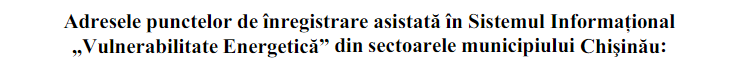 Persoanele/familiile aflate în dificultate, care nu dispun de echipamente, nu au acces la internet sau nu au abilitățile necesare pentru a se înregistra individual pe platforma compensatii.gov.md vor fi asistate de către asistenții sociali comunitari sau de către bibliotecari. În acest context, Primăria municipiului Chișinău a publicat o listă a punctelor de înregistrare asistată în Sistemul Informațional „Vulnerabilitate Energetică”.