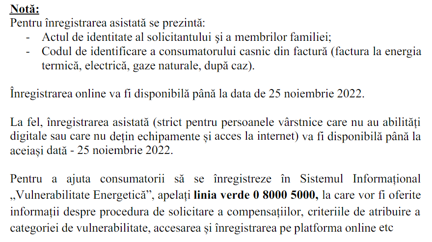 Pentru a ajuta consumatorii să se înregistreze în Sistemul Informațional „Vulnerabilitate Energetică”, cetățenii pot apela la linia verde 0 8000 5000, la care vor fi oferite informații despre procedura de solicitare a compensațiilor, criteriile de atribuire a categoriei de vulnerabilitate, accesarea și înregistrarea pe platforma online.