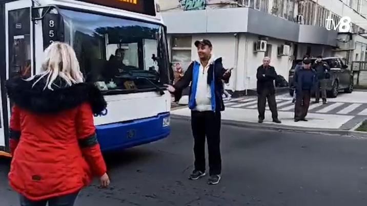 Un protestatar a ieșit în mijlocul drumului și a încercat să blocheze circulația unui troleibuz. Ulterior, poliția a intervenit pentru a rezolva problema.