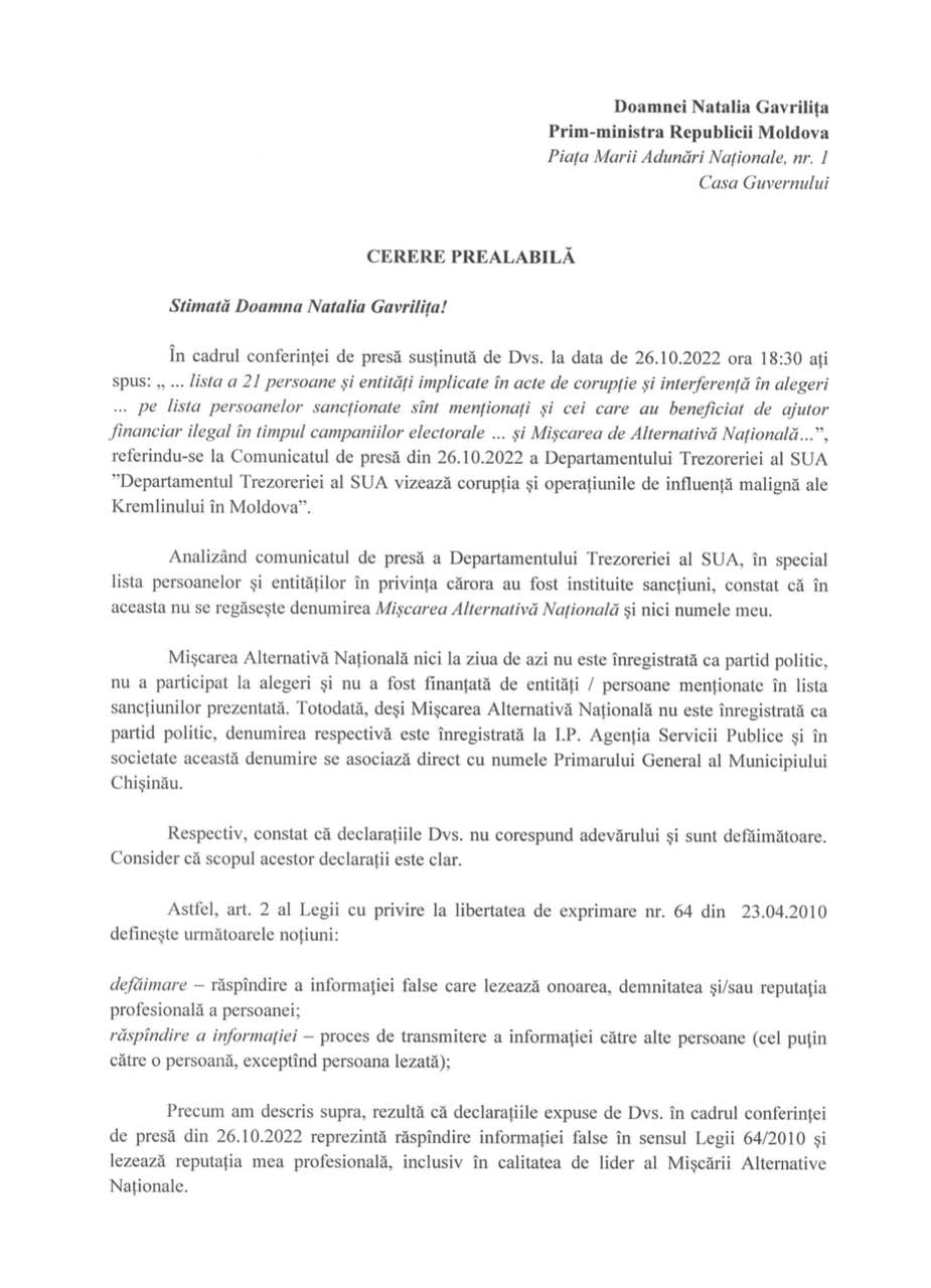 Primarul Capitalei, Ion Ceban anunță că va depune cerere prealabilă de chemare în judecată a premierului Natalia Gavriliță și ministrului Justiției Sergiu Litvinenco, învinuindu-i de lansarea unei campanii de dezinformare la adresa sa, cu scopul de a crea probleme înregistrării partidului Mișcarea Alternativa Națională (MAN) și să descurajeze oamenii să susțină această formațiune.