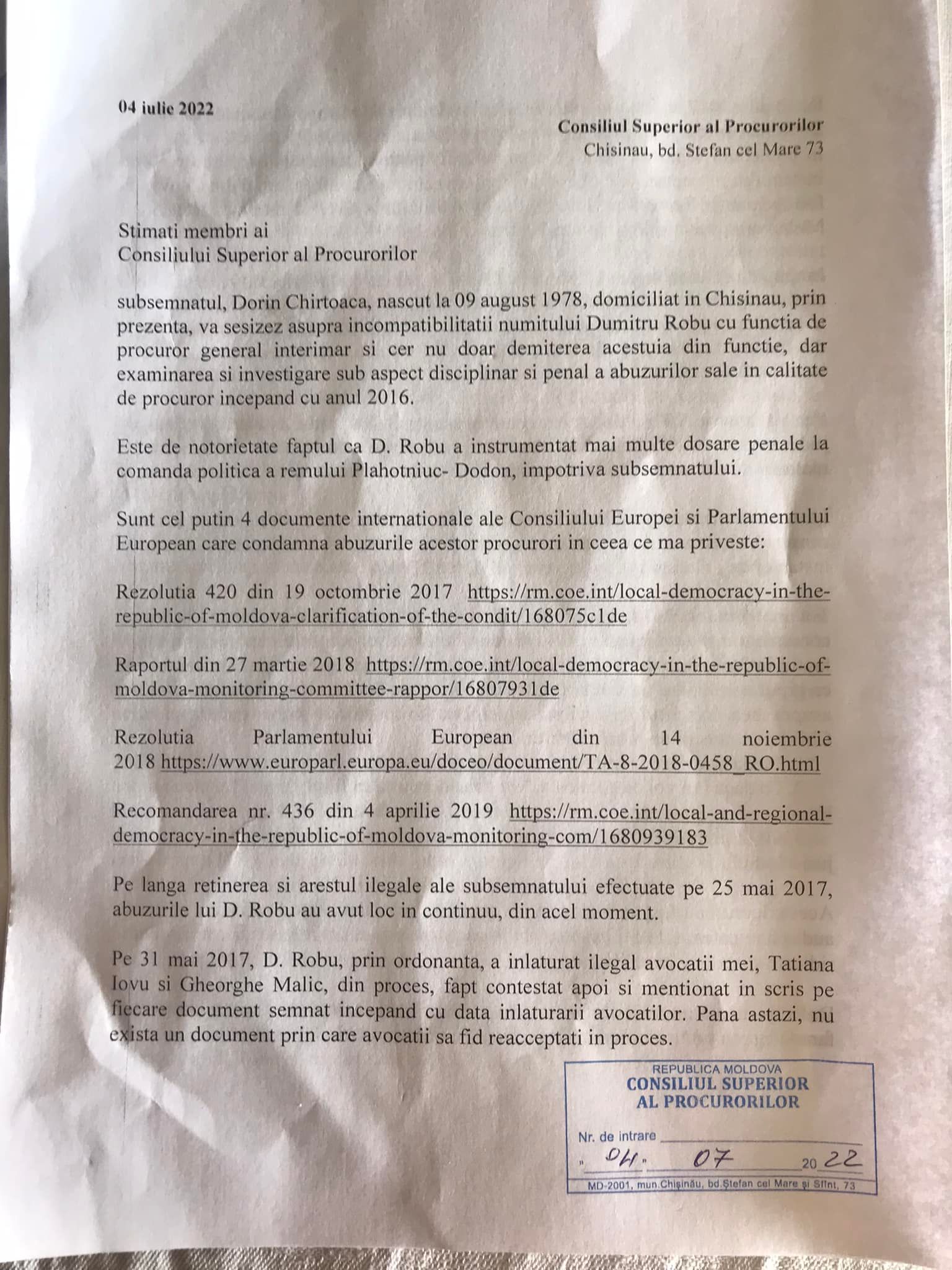 Fostul primar al Capitalei, Dorin Chirtoacă, cercetat în dosarul parcărilor cu plată, vrea demiterea și tragerea la răspundere penală și disciplinară a șefului interimar al Procuraturii Generale (PG), Dumitru Robu. Chirtoacă a făcut chiar și o sesizare la Consiliul Superior al Procurorilor (CSP), în care se plânge de abuzurile pe care le-ar fi comis Robu în procesul de instrumentare a dosarelor penale pe numele său și acuză PG că nu renunță la învinuiri, deși nu are probe împotriva sa.