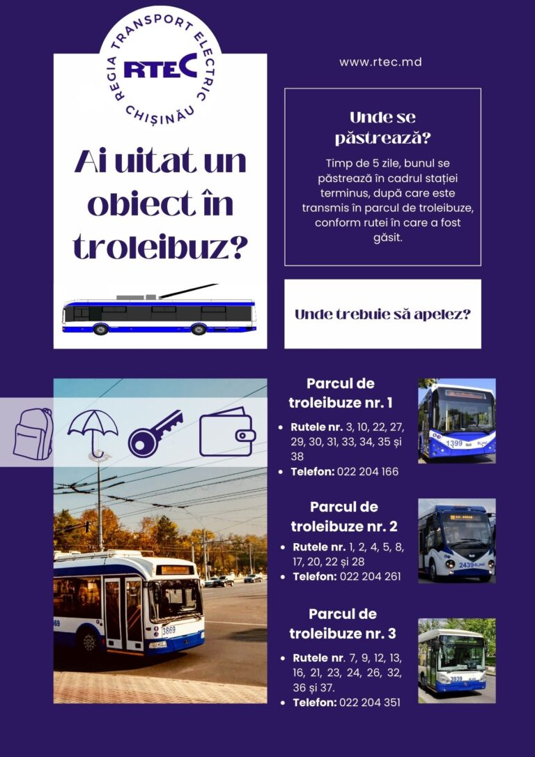 Dacă călătorii au uitat un obiect în troleibuz, aceștia trebuie să cunoască că timp de cinci zile, bunul se păstrează în cadrul stației terminus, după care este transmis în parcul de troleibuze, conform rutei în care a fost găsit. Regia Transport Electric Chișinău a publicat lista adreselor la care trebuie să meargă oamenii pentru a-și găsi lucrurile pierdute, în funcție de ruta troleibuzului: