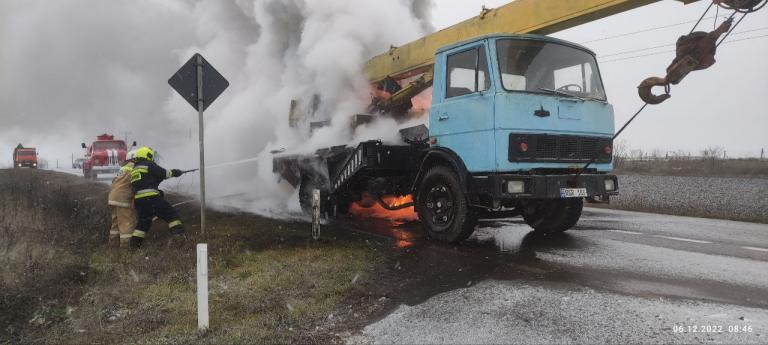 La fața locului, s-au deplasat echipe de pompieri, care au stabilit că focul a afectat platforma autospecialei. Salvatorii au reușit localizarea arderii către ora 08:46.