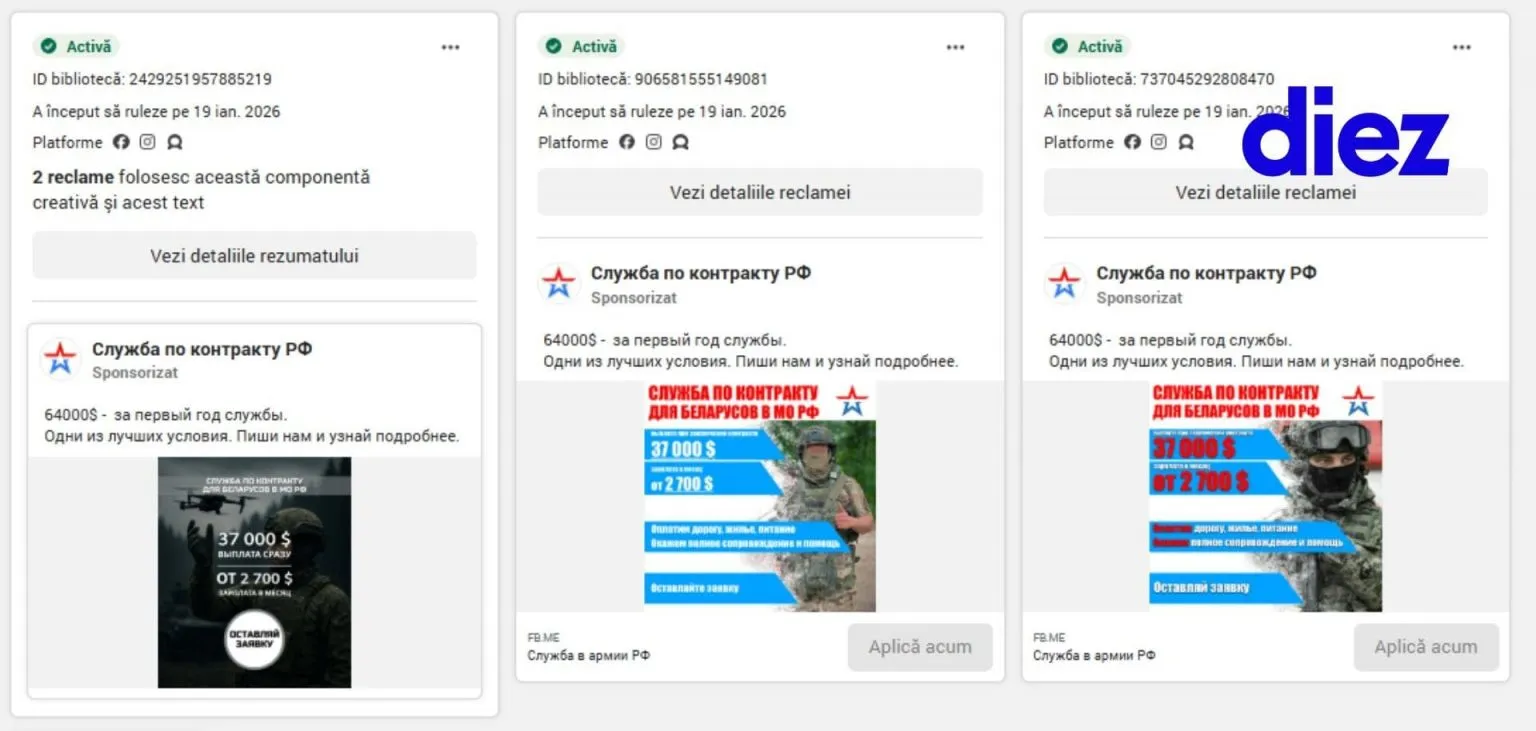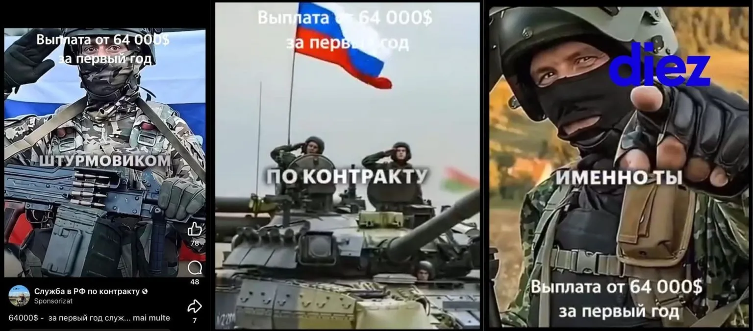 La sfârșitul lunii ianuarie, au fost identificate postări sponsorizate care căutau „штурмовики” - luptători trimiși în prima linie. Un cont neoficial, „Служба в РФ по контракту” (Serviciu în Federația Rusă sub contract), promitea aproape 65.000 de lei lunar și circa 500.000 de lei pentru semnarea contractului. Discuțiile erau redirecționate pe Telegram și WhatsApp, iar persoana din spatele contului, prezentată drept „Roman”.