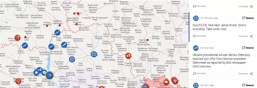 Site-ul liveuamap.ua care oferă actualizări în timp real privind luptele din Ucraina arată că sirenele au început să sune în capitala Ucrainei la ora 15:23, acesta notând că autoritățile au avertizat locuitorii să se adăpostească de urgență.