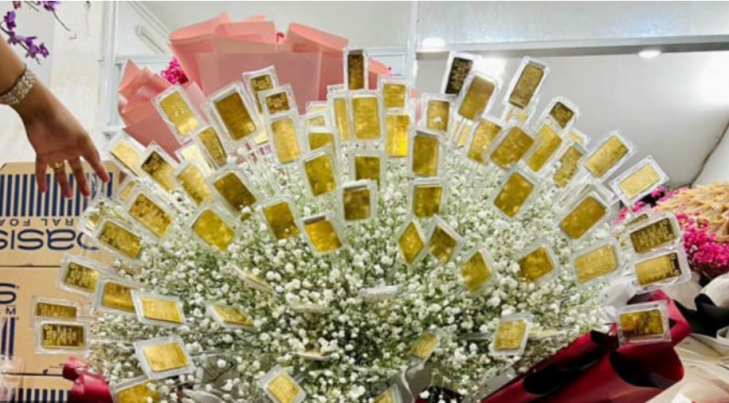 Un bărbat din Vietnam a cumpărat pentru o femeie un buchet de flori realizat din 100 de foiţe de aur, în valoare de peste 300.000 de dolari, pe care i l-a dăruit cu prilejul Zilei internaţionale a femeii, notează digi24.