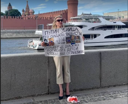 Marina Ovsiannikova a ieșit cu o pancartă în fața Kremlinului. În mâinile fostei angajate al „Первый Канал”, care a demisionat din cauza împotrivirii față de invazia rusă, după ce a ieșit în emisie directă cu un alt afiș anti-război, de data aceasta, a fost surprinsă cu o pancartă pe care scria „Putin este un criminal. Soldații lui sunt fasciști. Au murit 352 de copii. Câți copii trebuie să mai moară pentru tine ca să te oprești?"