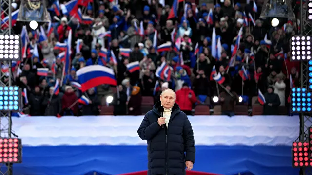 Stadionul, care a găzduit finala Cupei Mondiale în 2018, este plin de oameni care celebrează la ordinul autorităților ruse anexarea Peninsulei Crimeea de către Federația Rusă. Presa rusă scrie că aproape 100 de mii de oameni sunt pe stadion, iar apriximativ 130 de mii în afara acestuia.