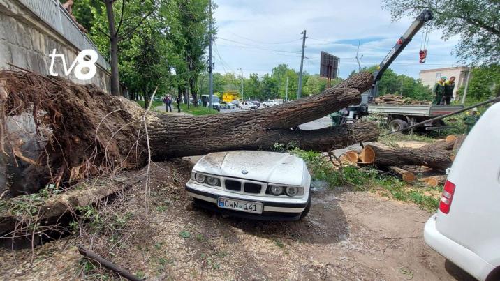 Un alt copac a căzut în Capitală! O mașină a fost distrusă, iar un pilon electric a căzut la pământ