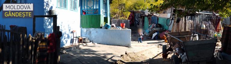 De când au revenit cu toții acasă, familia este monitorizată de autoritățile publice locale și beneficiază de toate pachetele de ajutor social, ne spune primarul. De obicei, vizitele sunt neanunțate. Am mers și noi, tot fără să prevenim, acasă la cei doi soți. Când am ajuns la poartă, în curte era doar băiețelul cel mic. Stătea singur, doar în ciorapi și încerca ceva să ne spună.
