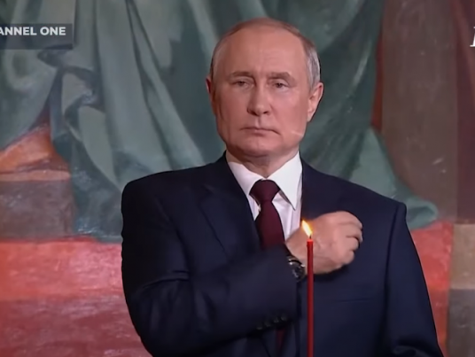 Îmbrăcat într-un costum albastru, cu o cămaşă albă şi cravată violet închis, Putin a stat în Catedrala Hristos Mântuitorul din Moscova cu o lumânare roșie aprinsă în mână, în timpul slujbei de Înviere, scrie Sky News.