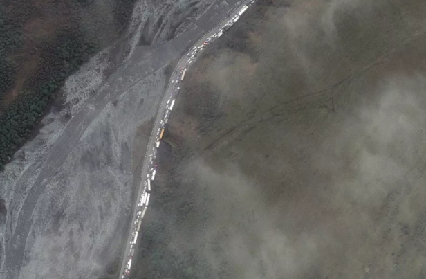 Maxar Technologies precizează că imaginile care prezintă partea cea mai nordică a ţării arată maşini ce se întind pe o coadă de aproximativ 16 kilometri (aproximativ 10 mile) la punctul de trecere a frontierei şi adaugă că „ambuteiajul în trafic a continuat probabil și mai la nord de zona fotografiată”. O înregistrare video surprinsă luni din dronă sugerează că sute de vehicule s-au îngrămădit pe partea rusă, martorii spunând că oamenii aşteaptă până la 48 de ore pentru a trece în Georgia.