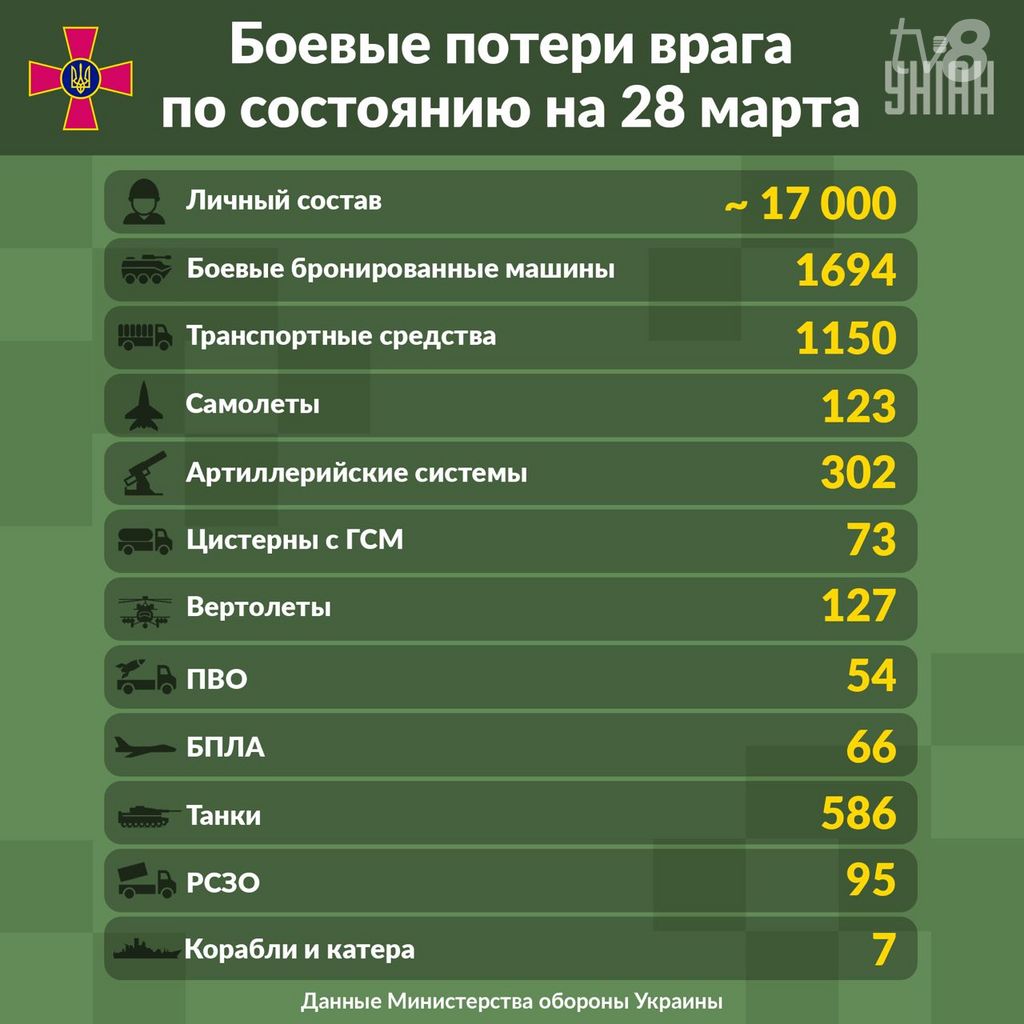 UPDATE: Ministerul ucrainean al Apărării prezintă bilanțul pierderilor înregistrate de armata rusă de la începutul invaziei până pe 28 martie 2022. Oficialii ruși nu au comentat datele prezentate.