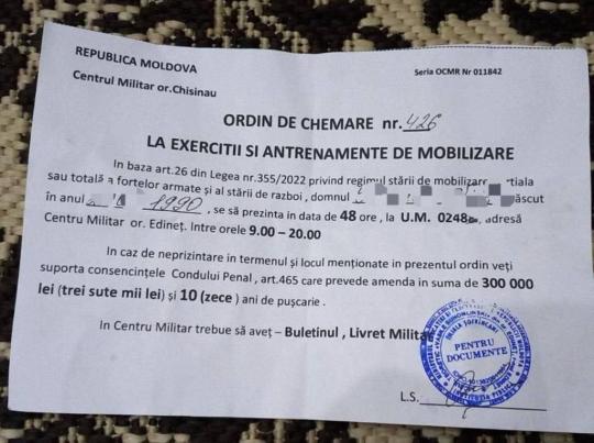 După ce în spațiul public au apărut informații, precum că Ministerul Apărării al Republicii Moldova ar chema la Centrele Militare tinerii pentru antrenamente de mobilizare, autoritățile s-au autosesizat și susțin că documentele cu privire la chemare sunt niște falsuri. Poliția a prins făptașul.