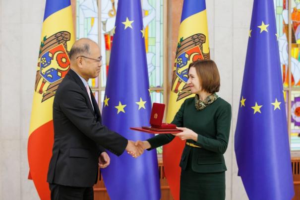 În semn de apreciere pentru contribuția adusă la dezvoltarea relațiilor moldo-nipone și pentru sprijinul oferit la modernizarea țării noastre, Președinta Maia Sandu i-a conferit Ambasadorului Yoshihiro Katayama „Ordinul de Onoare”.
