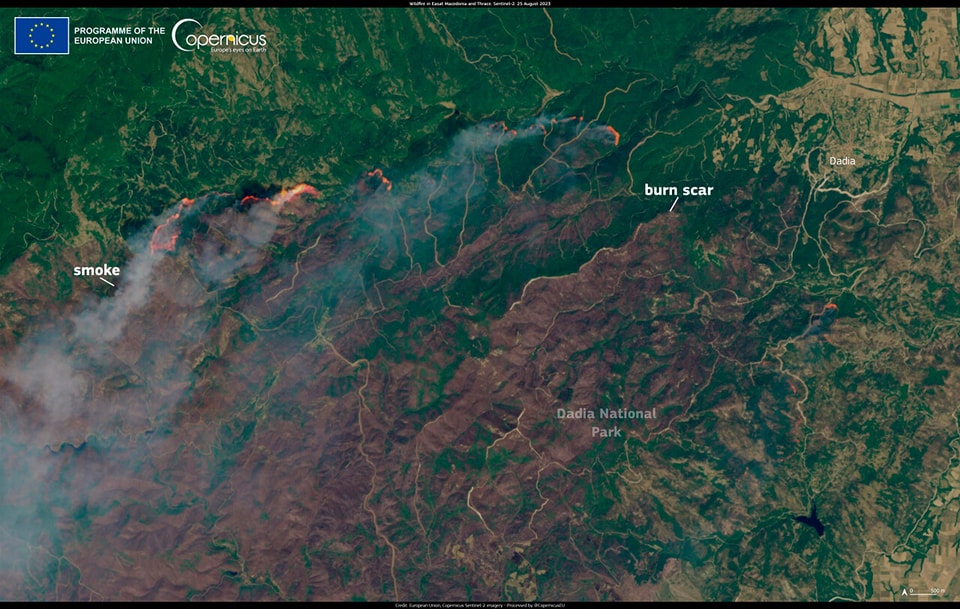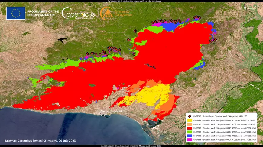 Potrivit Serviciului Copernicus, imaginea prezintă evoluția zonei afectate între 20 și 26 august 2023. Duminică, 27 august, incendiul din zona Alexandroupolis ardea încă, iar vântul întețea flăcările, îngreunând eforturile de stingere. În jur de 295 de pompieri, șapte avioane și cinci elicoptere încercau încă să domolească focul.