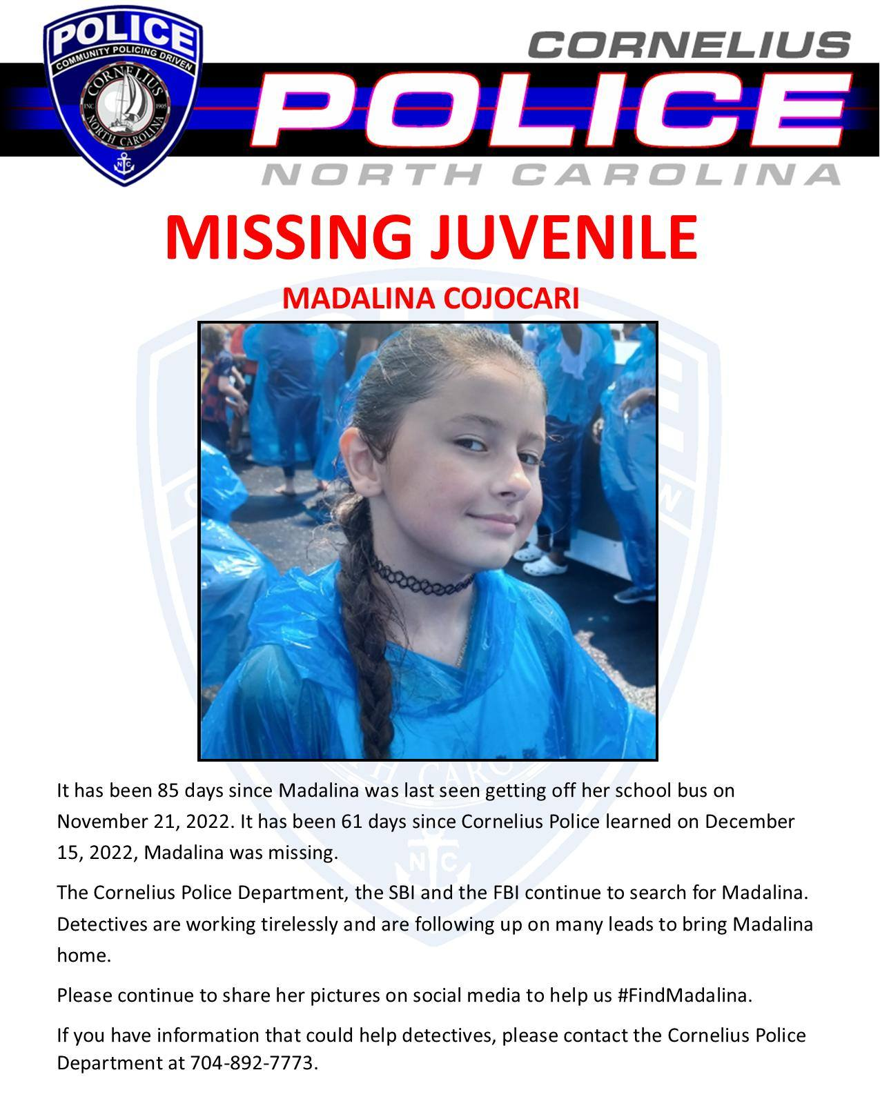 Au trecut 85 de zile de când Mădălina, fetița unei moldovence stabilite în Carolina de Nord, SUA, a fost văzută ultima dată coborând din autobuzul școlar pe 21 noiembrie 2022. Au trecut și 61 de zile de când Poliția Cornelius a aflat pe 15 decembrie, de dispariția fetei. Potrivit oamenilor legii, „detectivii lucrează neobosit și urmăresc mai multe piste pentru a o aduce acasă”.