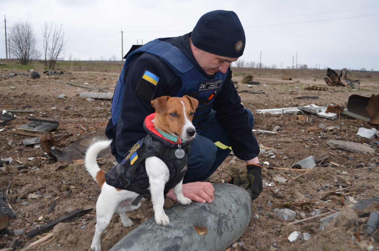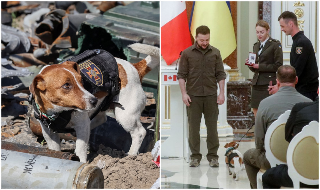 Patron, câinele devenit cunoscut după ce, de la începutul războiului, a ajutat la găsirea a sute de mine, a avut parte de onoruri militare. Președintele ucrainean Volodimir Zelenski l-a decorat, pe 8 mai, „pentru curajul și devotamentul său”.