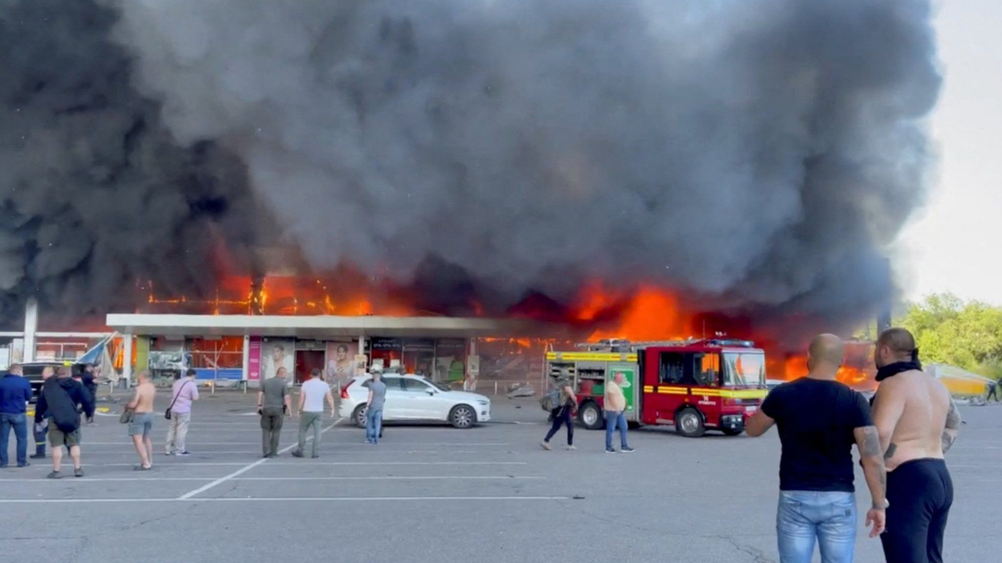 Imagini groaznice au fost surprinse de camerele de supraveghere la Kremenciuk, lângă centrul comercial Amstor, care a fost distrus de soldații ruși, în urma unui atac cu rachete luni, 27 iunie. În timpul exploziei, copacii s-au cutremurat, păsările și-au luat zborul, iar oamenii au încercat să se ascundă.