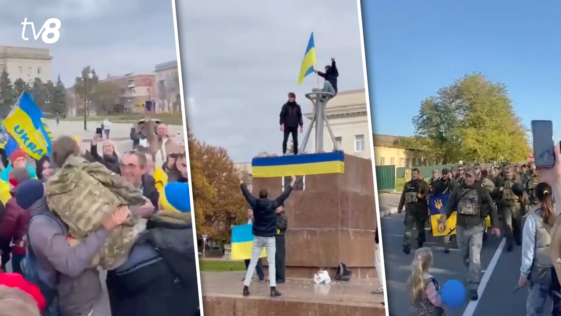 Pe 11 noiembrie, soldații ucraineni au eliberat orașul Herson, după aproape nouă luni de ocupație rusă. Din mai multe videoclipuri postate pe rețelele de socializare, se aud strigătele de bucurie ale ucrainenilor, dar și lacrimile lor de fericire. Unii locuitori ai orașului au dat jos steagul rusesc de pe clădire și l-au înlocuit cu cel ucrainean când rușii au anunțat încheierea retragerii pe malul stâng al râului Nipru.