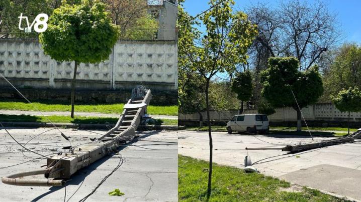 /VIDEO/ Stâlp de beton, prăbușit în mijlocul unei străzi din Chișinău: Circulație blocată