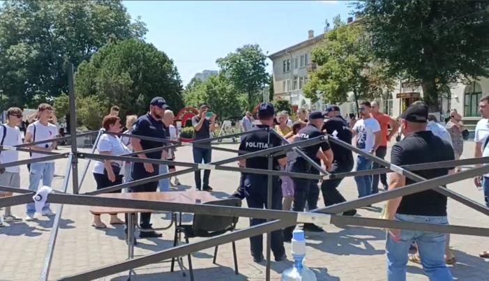 Altercații la Bălți! Oamenii legii au intervenit în centrul orașului, în piața Vasile Alecsandri, ca să demonteze un cort instalat de exponenții Partidului Politic Renaștere, pentru colectarea semnăturilor în vederea scoaterii în afara legii a partidului de guvernare PAS.