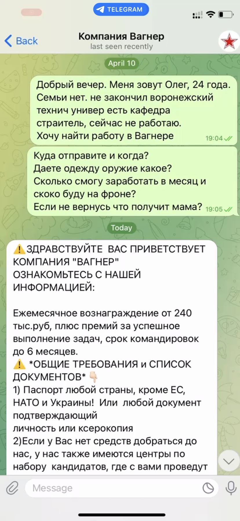 Primul pas a fost să scriu un mesaj, de pe un cont de Telegram, pe un număr indicat în anunțul de angajare al companiei Wagner.