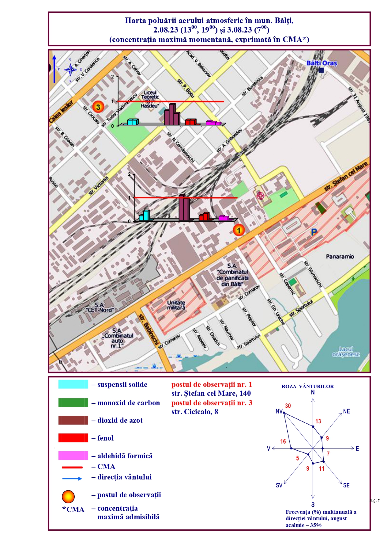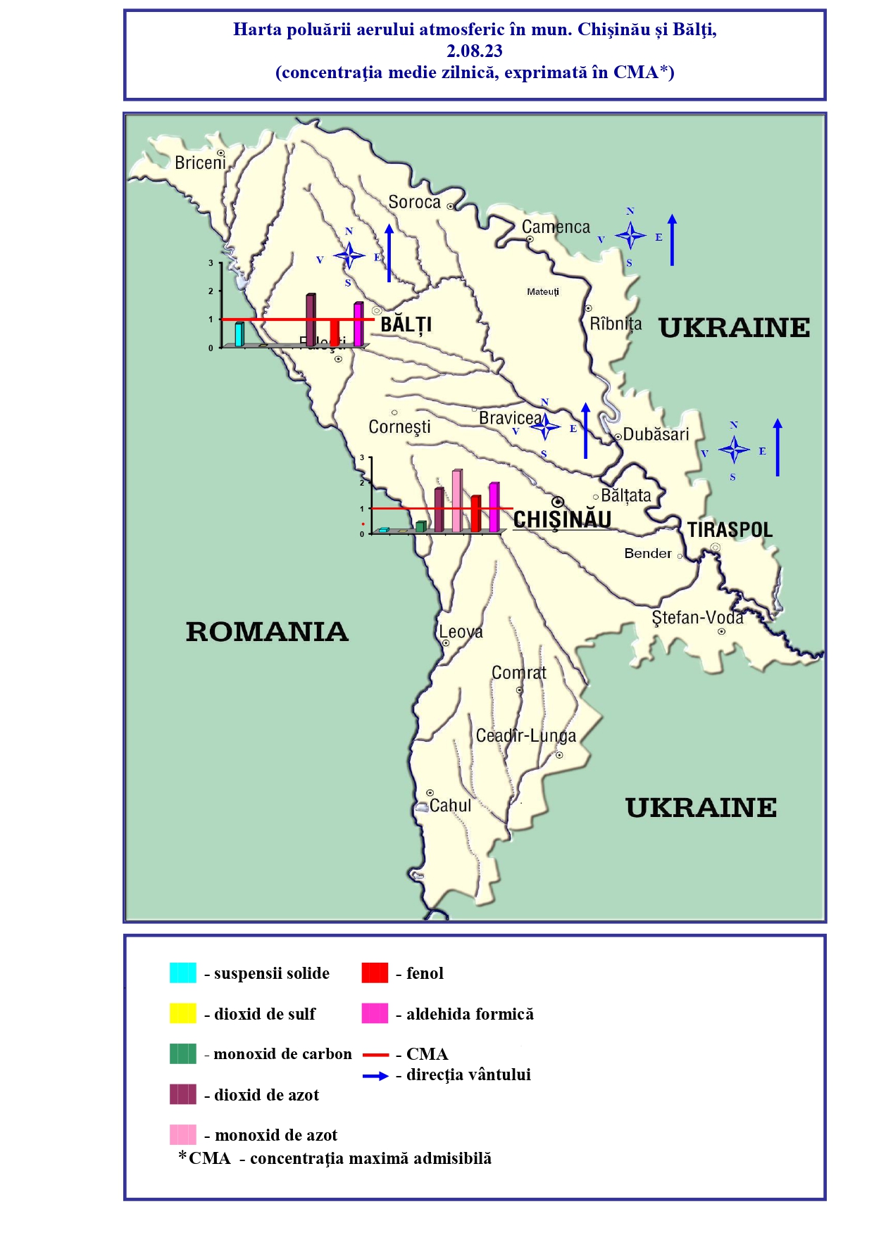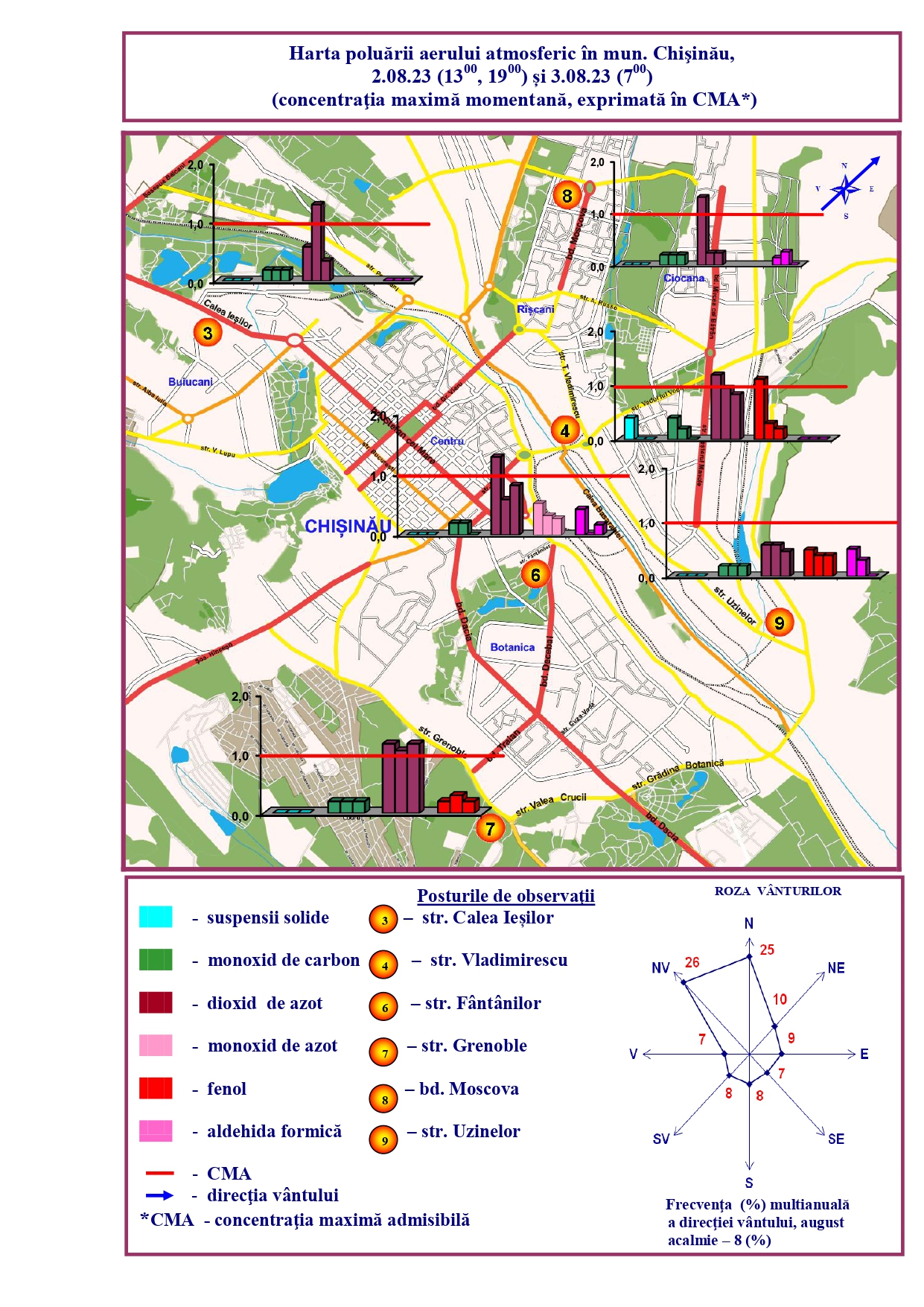 Astfel, joi, 3 august, concentrația maximă a depăşit norma sanitară în municipiul Chișinău pentru dioxid de azot de 1,3-1,5 ori, în regiunea străzilor Grenoble, T. Vladimirescu, Calea Ieșilor, Fântânilor, bd. Moscova, pentru fenol de 1,1 ori, în regiunea str. T.Vladimirescu, iar în mun. Bălți pentru dioxid de azot de 1,1 ori, str. Ștefan cel Mare.
