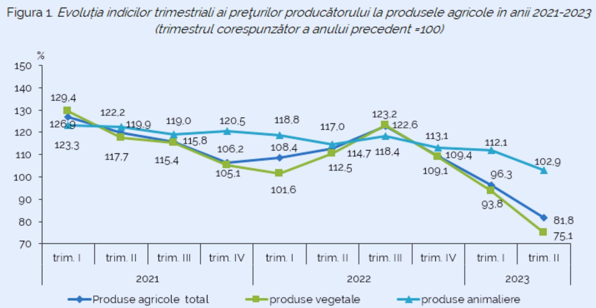 Mai accentuat au scăzut preţurile producătorului la rapiță – cu 36,2%, floarea-soarelui – cu 27,3%, soia – cu 22,0%, orz – cu 17,2%, grâu – cu 15,8%, pomușoare de cultură – cu 11,6%, porumb boabe – cu 8%.