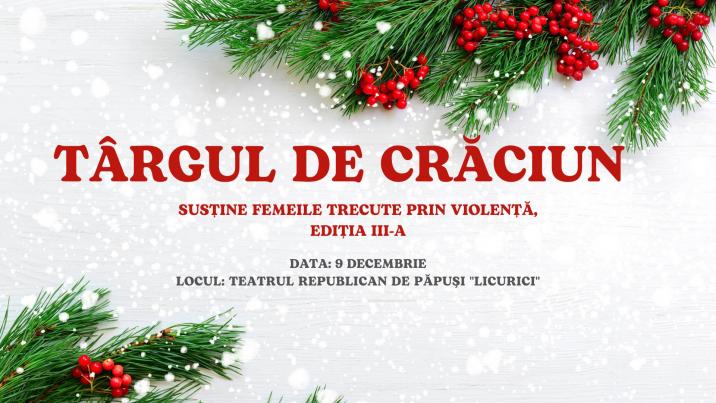 Asociația Împotriva Violenței „Casa Mărioarei” organizează, pe 9 decembrie, cea de-a treia ediție a Târgului de Crăciun în sprijinul femeilor victime ale violenței. Evenimentul va avea loc la Teatrul Republican de Păpuși „Licurici”, între orele 10:00 și 16:00.
