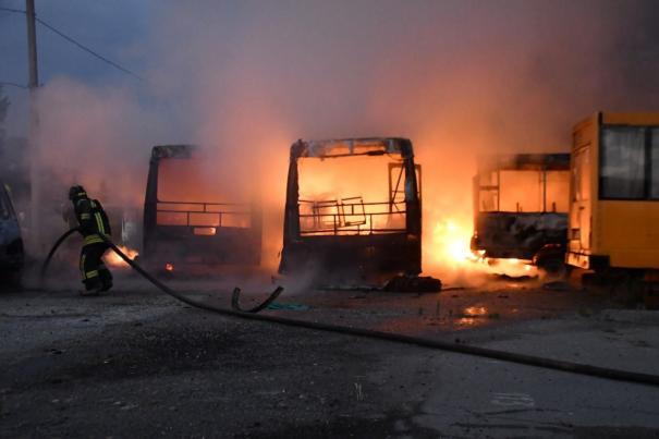 UPDATE „Teroriștii ruși au atacat obiective civile din Herson”, anunță șeful biroului prezidențial al Ucrainei, Andrei Ermak. În spațiul public au apărut imagini din momentul în care pompierii intervin la un incendiu produs la o stație terminus din oraș, unde ardeau 10 microbuze, după atac. Totodată, presa anunță că au ars inclusiv o benzinărie, mai multe depozite și săli expoziționale. Deocamdată, nu există informații despre eventuale victime.