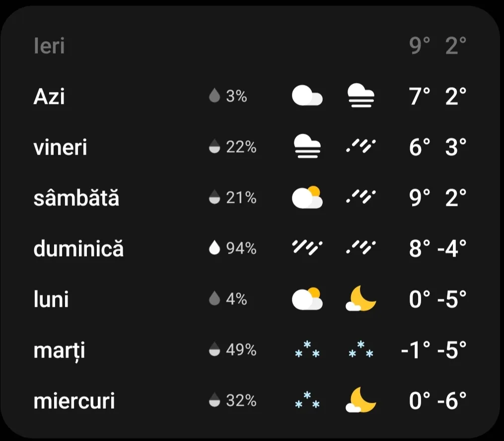 Pentru mâine, meteorologii prognozează temperaturi de până la +8 grade în timpul zilei, iar noaptea de până la 0 grade. Pentru 14 și 15 februarie se așteaptă ploi, iar în zilele de 17 și 18 a lunii am putea avea ninsori.