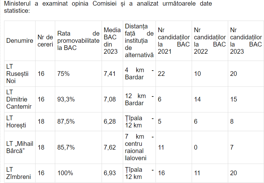 În opinia Comisiei raionale de admitere, LT Ruseștii Noi, LT „Dimitrie Cantemir” din Văsieni, LT Horești, LT „Mihail Bârcă”, satul Mileștii Mici, LT Zîmbreni nu întrunesc condițiile prevăzute de Metodologie.