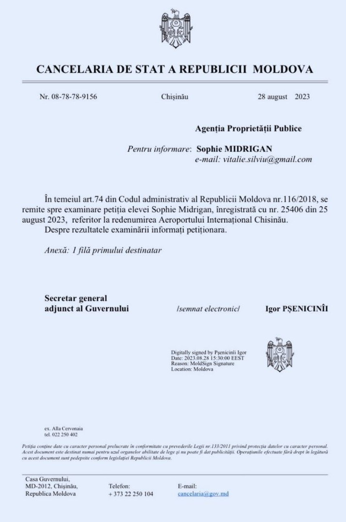 Tânăra a mai ținut să precizeze că ideea privind redenumirea Aeroportului Chișinău nu trebuie asociată cu vreo acțiune politică, fiindcă este inițiativa ei personală.