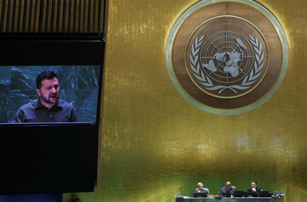 Președintele ucrainean Volodimir Zelenski a stârnit aplauze, marţi, când şi-a ocupat locul la pupitrul Adunării Generale a ONU din New York, purtând o cămașă de culoare verde măsliniu, la prima sa apariție la Adunarea Generală anuală a ONU de când Rusia i-a invadat ţara, în 2022. „Ucraina face totul pentru a se asigura că, după agresiunea rusă, nimeni din lume nu va îndrăzni să atace vreo naţiune”, a spus el. „Înarmarea trebuie să fie limitată, crimele de război trebuie pedepsite, oamenii deportaţi trebuie să se întoarcă acasă, iar ocupantul trebuie să se întoarcă pe propriul pământ”. „Trebuie să fim uniţi pentru a reuşi - şi o vom face”, notează Mediafax.