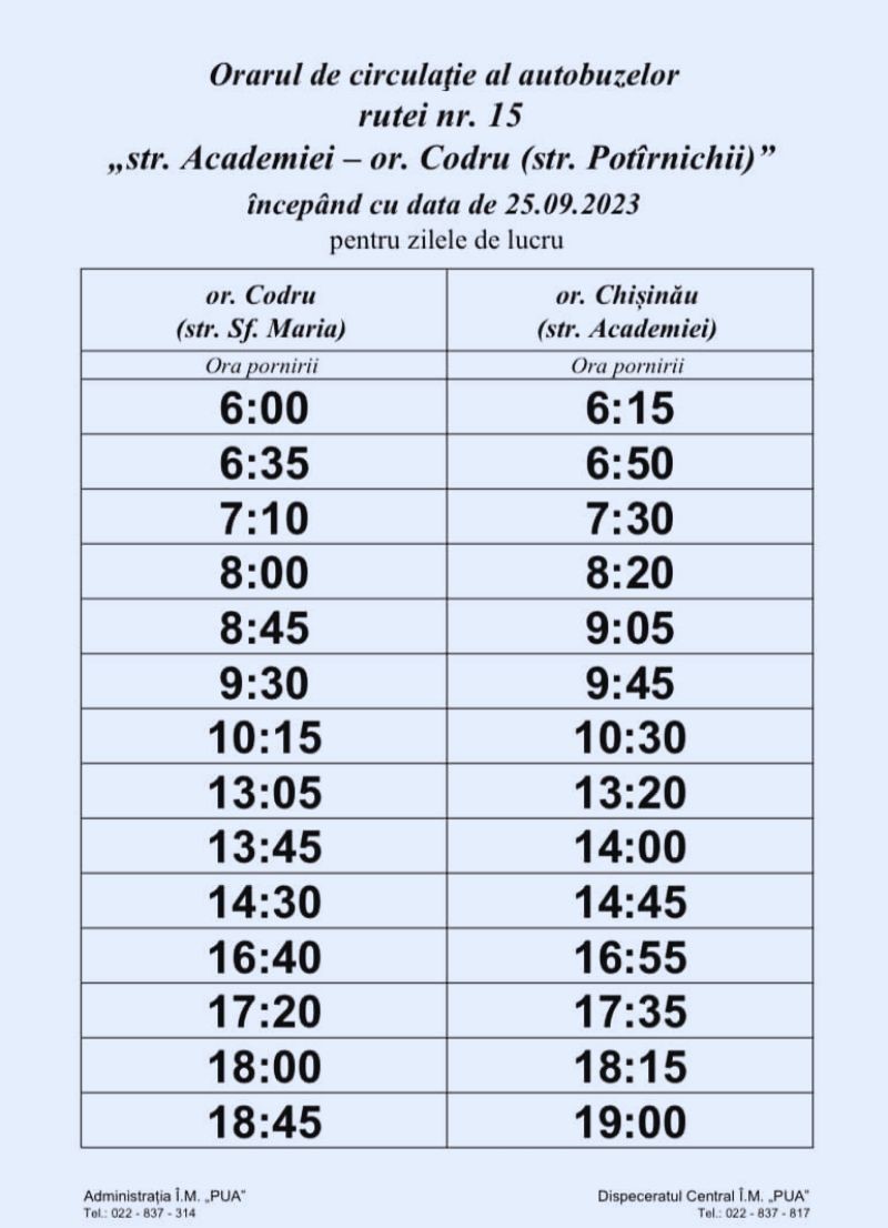 Pe 25 septembrie a fost lansată noua rută de autobuz - nr. 15 - pentru locuitorii din orașul Codru. Despre asta a anunțat primarul Capitalei, Ion Ceban, în cadrul ședinței săptămânale a Primăriei Chișinău. Autobuzele vor porni din Chișinău, strada Academiei, iar stația terminus a fost stabilită pe str. Potîrnichii intersecție cu str. Sfînta Maria din Codru.