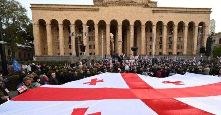 Duminică, manifestanții din fața clădirii parlamentului din capitala Tbilisi au fluturat drapelul Georgiei, Ucrainei și ale Uniunii Europene și au ținut un banner uriaș pe care scria: „Pentru un viitor european”.