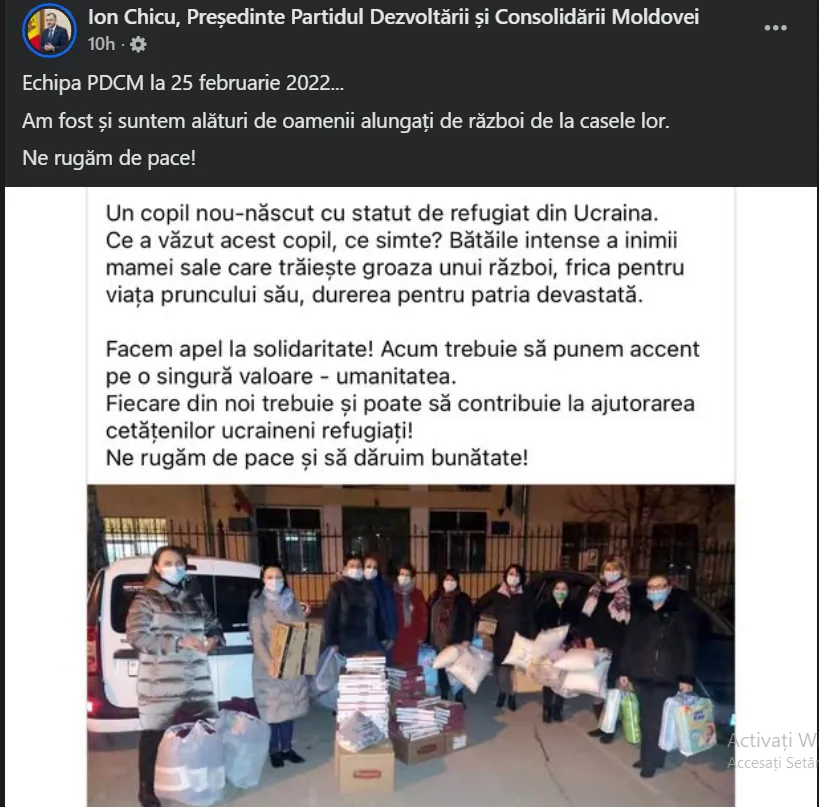 Deputatul fracțiunii parlamentare „Blocul Alternativa” și liderul Partidului Dezvoltării și Consolidării Moldovei, Ion Chicu, a transmis un mesaj de susținere a celor nevoiți să fugă din calea războiului, fără nicio referire la Rusia, care a invadat țara vecină: „Echipa PDCM la 25 februarie 2022... Am fost și suntem alături de oamenii alungați de război de la casele lor. Ne rugăm de pace!”