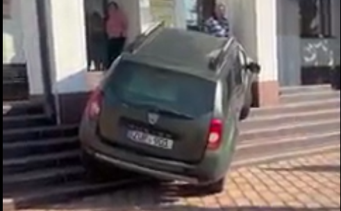 Protest inedit la Hîncești! Un bărbat și-a „parcat” dimineață mașina pe scările Primăriei din oraș.