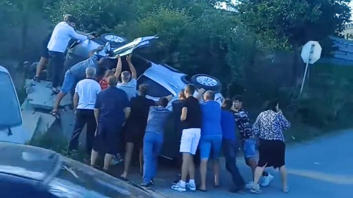 Din imaginile publicate pe rețelele de socializare, se vede cum câțiva oameni au sărit în ajutor pentru a scoate persoanele blocate într-o mașină.