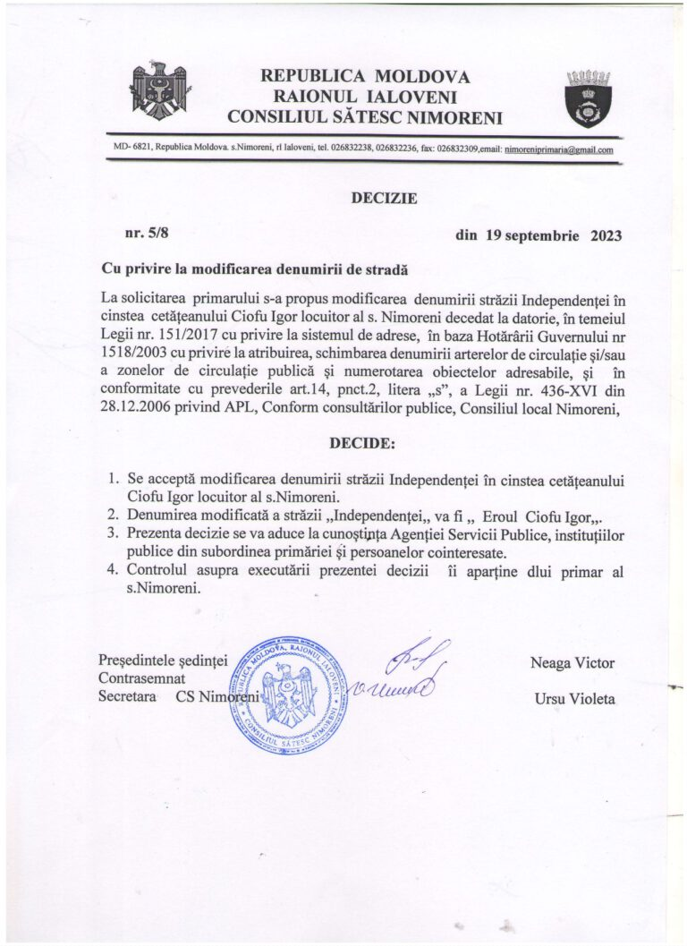 Conform deciziei, strada Independenței va fi redenumită în strada Eroul Ciofu Igor. De asemenea, prin decizia Consiliului, Igor Ciofu a fost declarat Cetățean de Onoare al satului Nimoreni, postmortem.