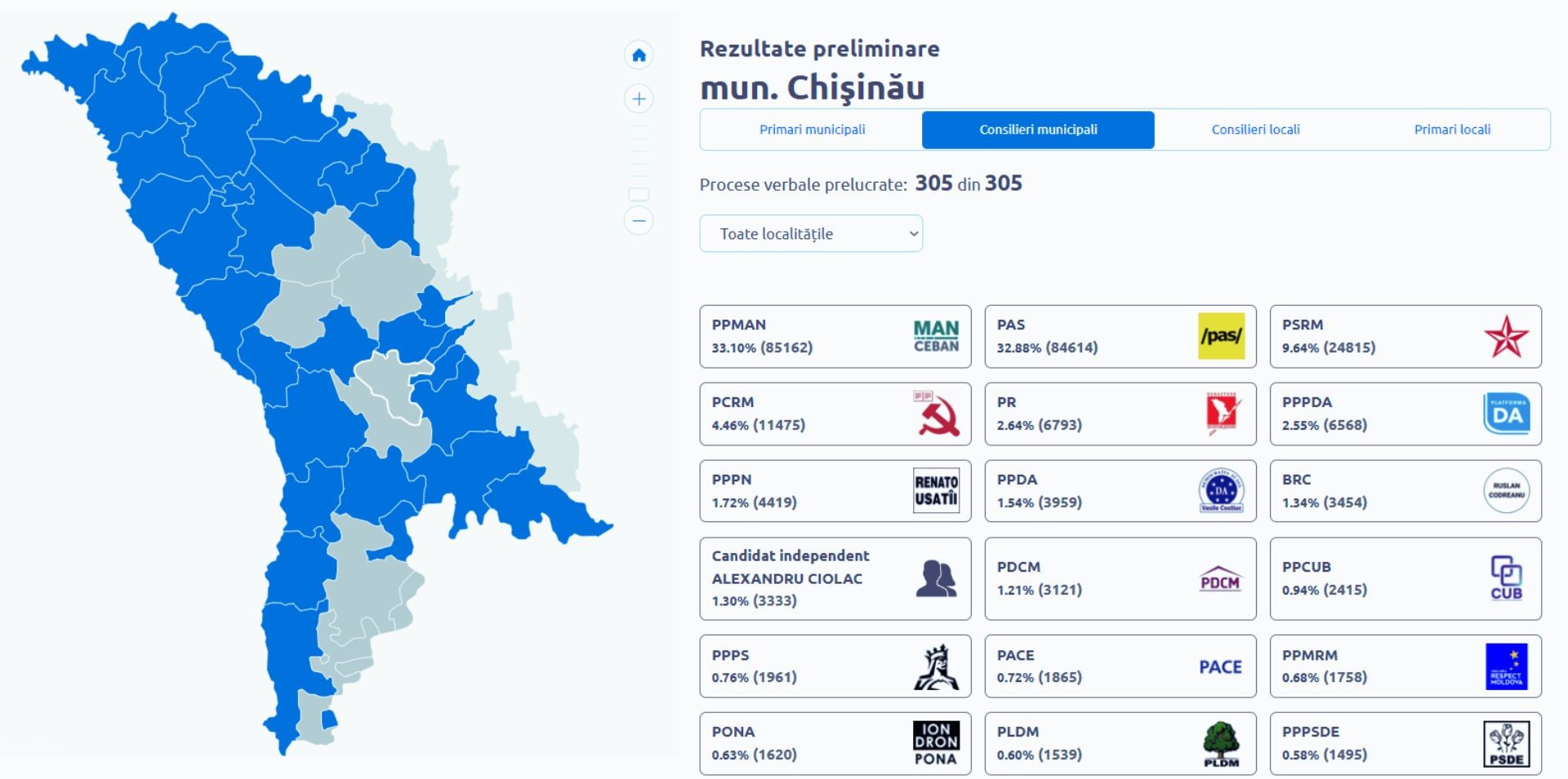 Datele pentru ocuparea mandatelor de consilier municipal arată că după prelucrarea a 279 de procese verbale din cele 305, cele mai multe voturi merg către echipa de aleși ai partidului MAN- 33,61%. Pentru echipa de consilieri PAS se distribuie 32,24% din sufragii. PAS este urmat de PSRM cu 10,01%.