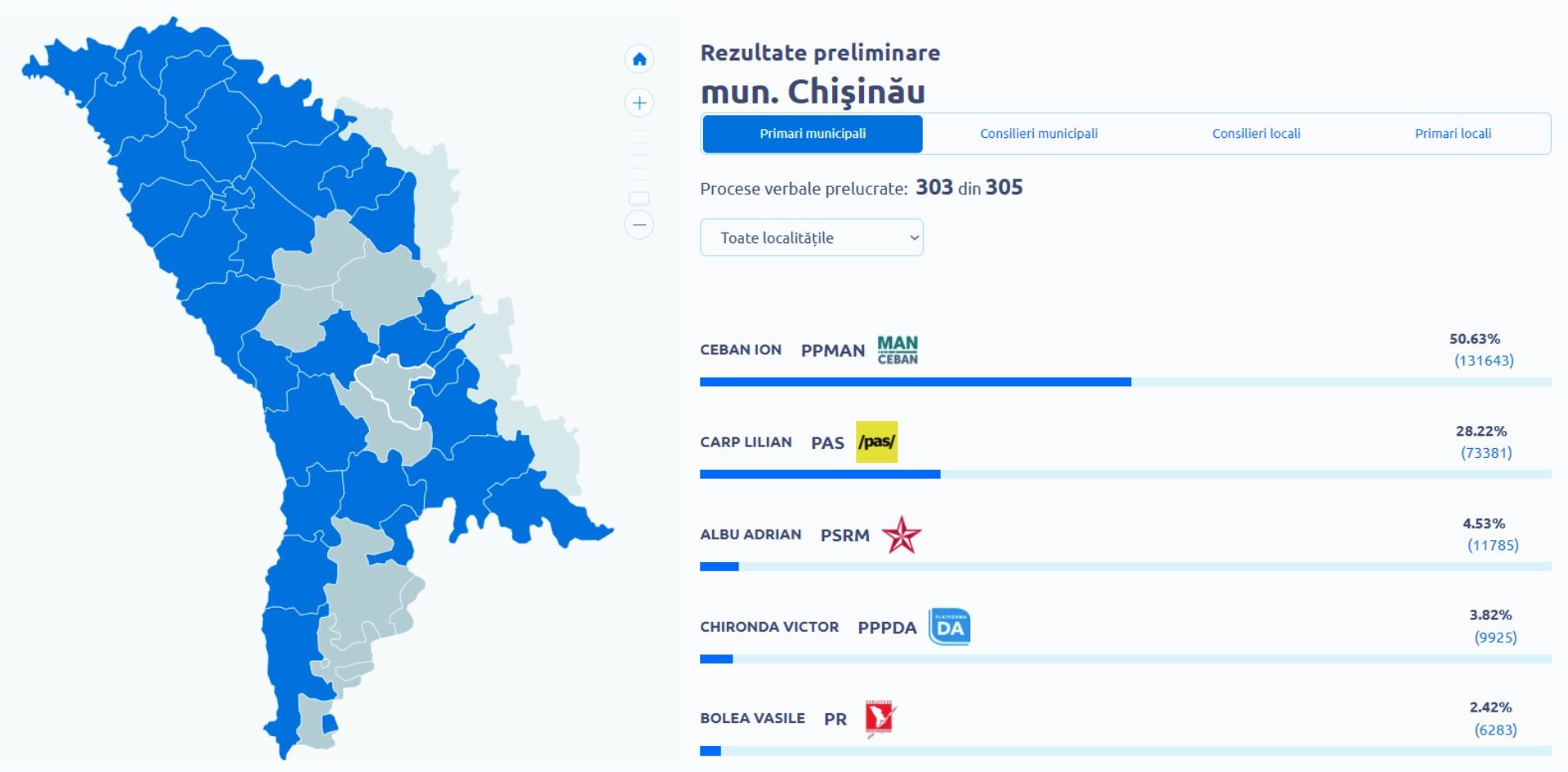 UPDATE: După prelucrarea a 288 de procese verbale din cele 305 din municipiul Chișinău, majoritatea voturilor se împart între candidatul MAN, Ion Ceban (50,91%) și candidatul PAS, Lilian Carp (28,15%). Alte 4,55 la sută am mers către candidatul socialist, Adrian Albu.