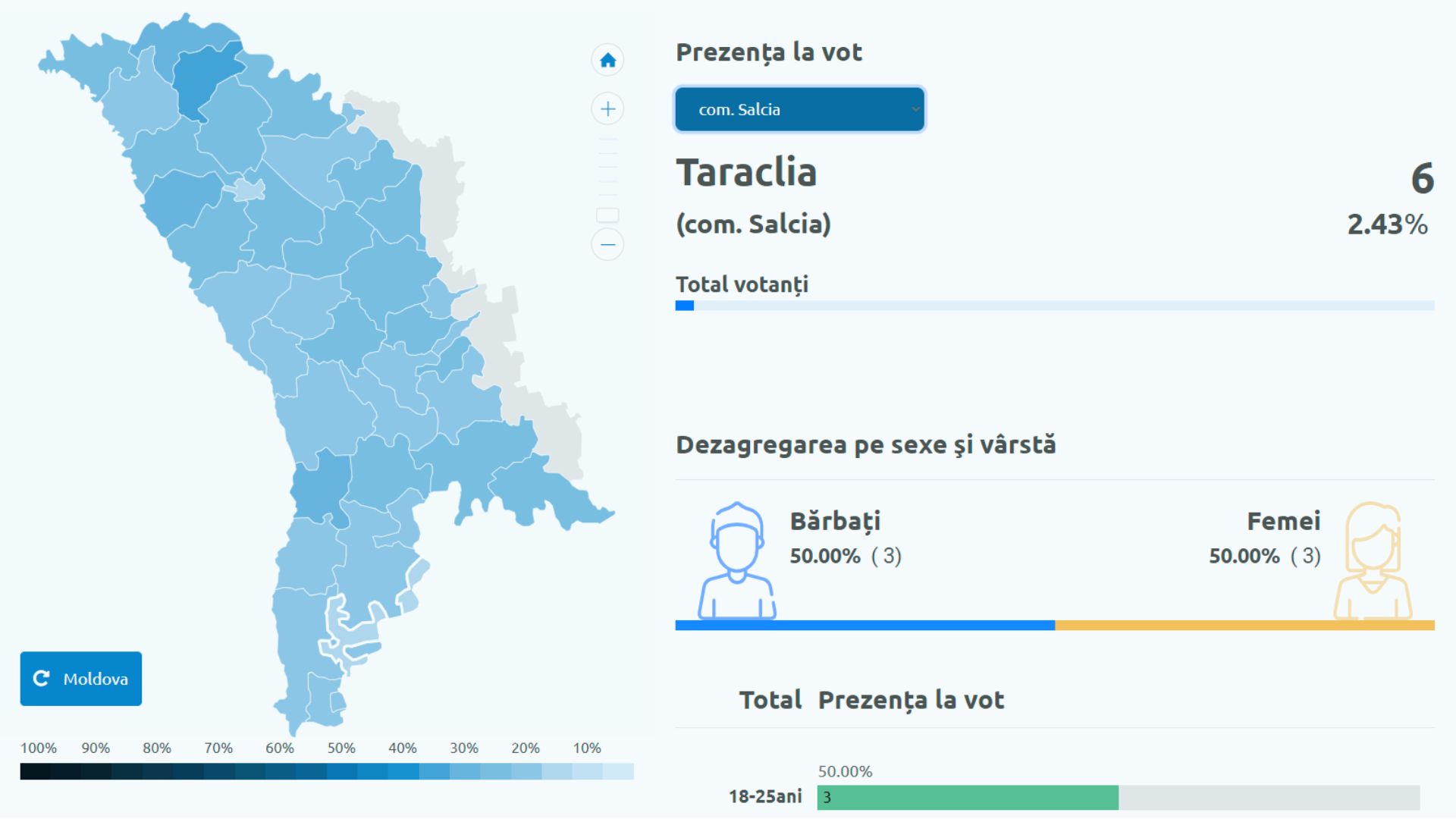 Zero voturi până la ora 11:00, în comuna Salcia din Taraclia, acolo unde se desfășoară alegeri repetate. De această dată, secția de votare a rămas fără lumină, astfel că și procesul de votare a fost întrerupt. După ce problema a fost remediată, la urne s-au prezentat abia 6 alegători. Potrivit datelor Comisiei Electorale Centrale (CEC), doar 2,43% din numărul total de alegători înscriși în liste s-au prezentat la vot.