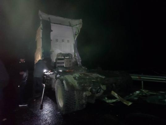 În urma impactului, camionul s-a răsturnat, iar șoferul automobilului a fost transportat la spital cu mai multe traumatisme.
