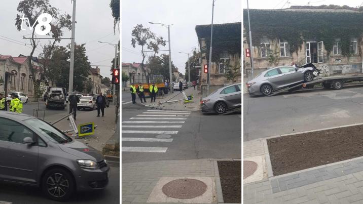 Ghinion de dimineață! Două mașini s-au ciocnit în Capitală și au doborât două indicatoare. Ce riscă șoferul vinovat
