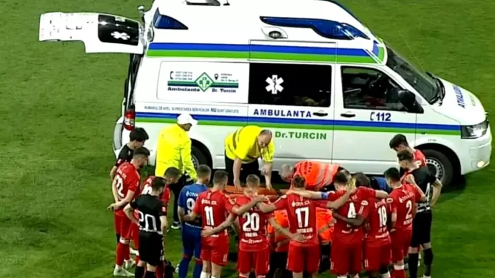 În minutul 71, a avut loc un moment de panică. După ce a șutat spre vinclu, puștiu Rareș Pop s-a prăbușit din senin pe gazon și a fost dus cu ambulanța la spital.