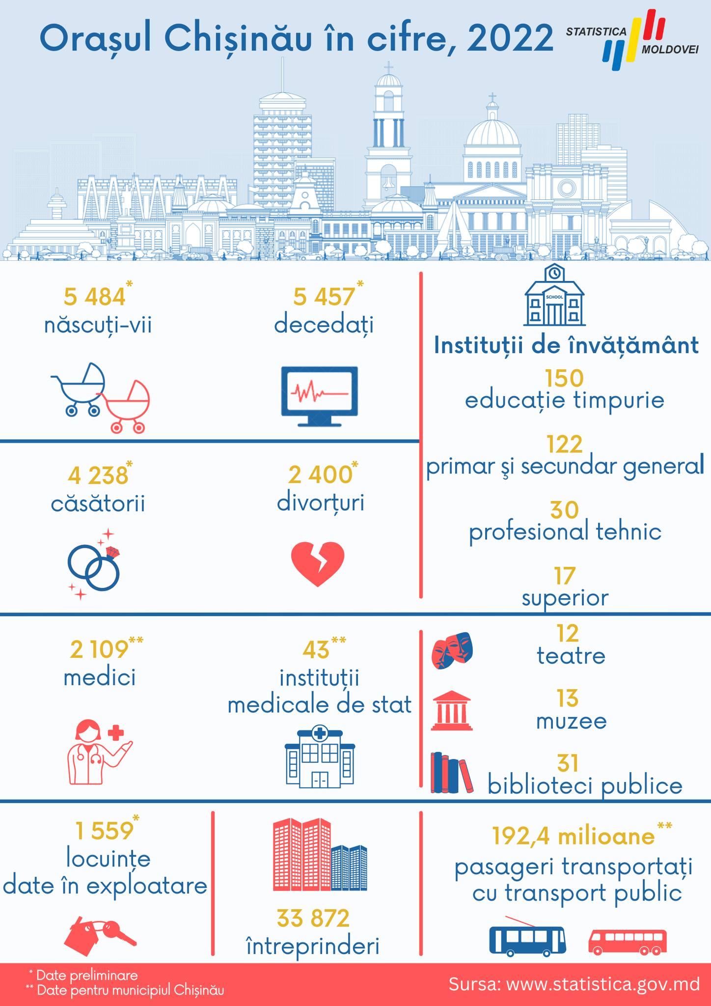 Aproximativ 5 484 de nașteri au fost înregistrate în municipiul Chișinău pe parcursul anului 2022. Potrivit datelor Biroului Național de Statistică (BNS), cifra este în scădere comparativ cu anul 2021, când au fost înregistrate 6.195 de nașteri. Totodată, aproximativ 5 457 de persoane s-au stins din viață.